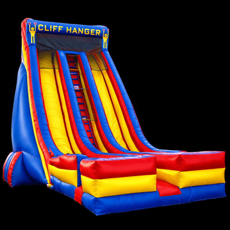 The 27' Cliff Hanger is Tri City's biggest and baddest inflatable slide available for rental! Standing almost three stories tall, this particular two-lane slide is great for kids and adults young at heart. Participants climb up the middle ladder to the top of the inflatable and grab onto the rings atop the left or right slide. Once the adrenaline settles, participants let go of the rings, dropping them almost straight-down the 27' steep slide. Participants then exit on the corresponding exits on either side of the inflatable. The 27' Cliff Hanger Slide is great for company picnics, church events, grad nights, and school carnivals. Due to the size of this inflatable, it is not recommended for home events. However, it can be rented for private home events if there is sufficient space. Kids should always be monitored when using this inflatable. If you are renting it for a large event, Jumping Around Party Rentals can provide an attendant for an additional charge.