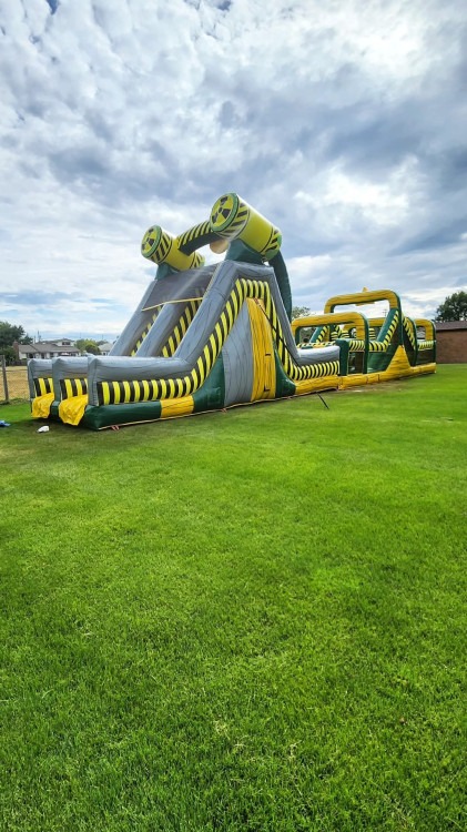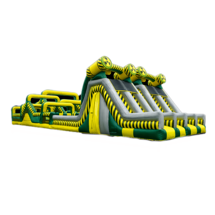 Get ready to race, climb, weave and slide through a bold, high-energy 60 ft obstacle course built for speed and competition — a dry, four-lane “toxic” themed challenge that fits perfectly into park days, fundraisers, field days, or large backyard events. Bright yellow, green and hazard-striped panels guide teams through a fast-paced layout that includes multiple crawl-through tunnels and pop-up obstacles, angled climbing sections, and four side-by-side lanes that let four racers go head-to-head for nonstop action. The finish features twin steep slides with safe, cushioned landings so every run ends with a big score and a big smile. Durable vinyl construction and roomy lane widths make this unit ideal for teens and adults as well as older kids; at 60 feet long and about 25 feet wide it requires a large, level set-up area and is designed for supervised rental use where competitive fun and spectator excitement are part of the plan.