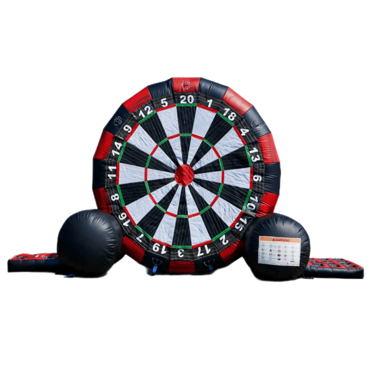 Play our Velcro Soccer Dart Game and you will be addicted at first kick. How high can you score on your soccer kicks? We supply 2 Velcro balls for you to compete against your opponent. Each player takes a turn kicking their Velcro soccer ball at the giant inflatable dart board. This fun game also has 2 side games. The side games can be folded when space is limited. Velcro Soccer Dart Game is a perfect team building corporate game rental and is a favorite at any soccer themed or Olympic game party. The Velcro Soccer Dart Game can be rented on grass or cement.
